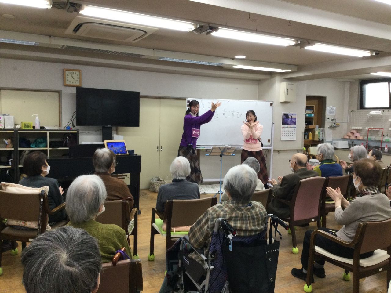 ボランティアの方々の特技を披露や、歌やゲームのレクリエーションで賑やかな時間です