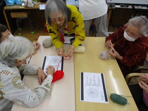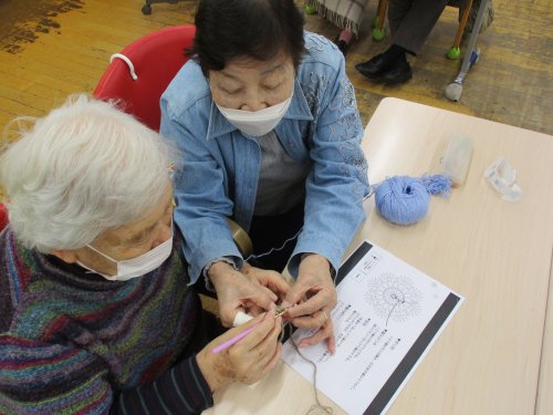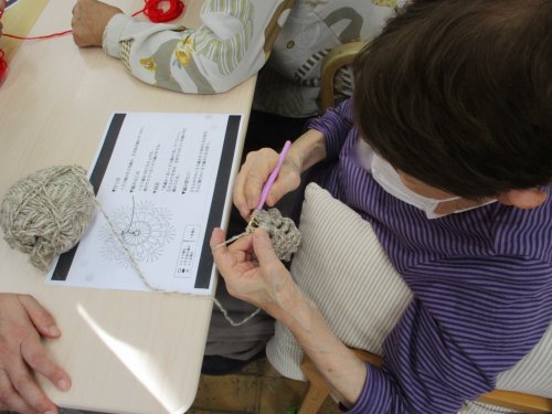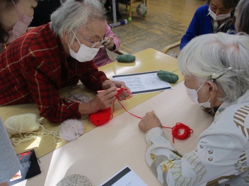 「なんだか懐かしいわ」と言いながら制作を進めているご利用者の姿もあれば、ご利用者同士で編み方を教え合う姿も見られ、編み物教室ならではの一面を見ることができました。