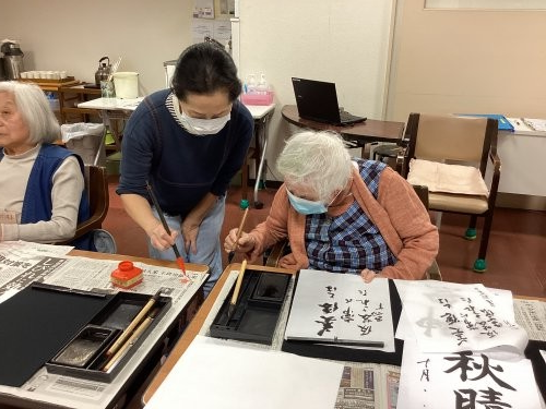 和田ふれあいの家の書道クラブでは、書道の講師が来所し丁寧に指導してくれる